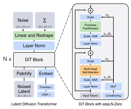 These image tokens then go through N DiT blocks which feature the adaptive layer norm. This is based on feature wise linear modulation (4) and adaptive instance normalization (5) which have shown to be effective conditioners used in GANs previously. The basic idea is to have an embedding which outputs scalars which either scale, shift, or modify the outputs / inputs of layers. This conditioning embedding's input is based on a sinusoidal positional embedding of the time (similar to original transformer paper), along with the input's class.